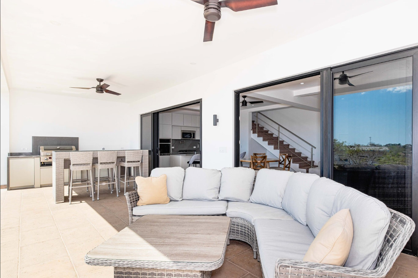 The client’s investment and commitment allowed us to build two additional floors that reached a height sufficient to provide unobstructed views of the ocean and breathtaking sunsets. The second level of the home is dedicated to entertainment and relaxation, featuring a custom-built infinity edge pool, both indoor and outdoor kitchens crafted from solid wood, a spacious indoor living and lounging area and a large unobstructed sunset party deck.